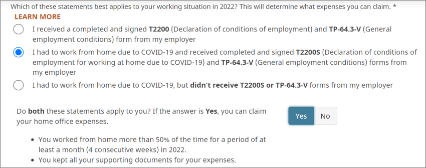 I had to work from home due to COVID-19 and received completed and signed T2200S (Declaration of conditions of employment for working at home due to COVID-19) and TP-64.3-V (General employment conditions) forms from my employer