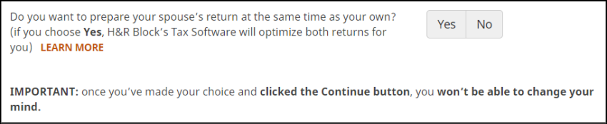 Note: Once you’ve decided to file your return a certain way (either as a coupled or uncoupled return), you can’t change your selection in H&R Block’s tax software. Instead, you would both have to start new returns.