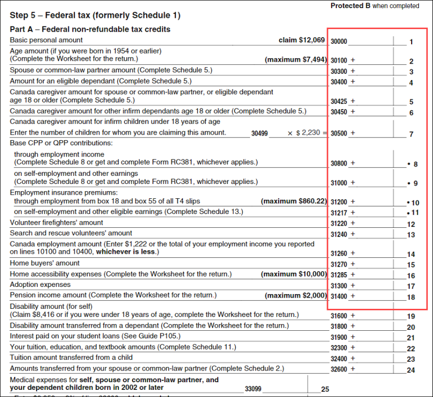 *Lines 1 to 18 represent your dependant’s federal non-refundable tax credits.