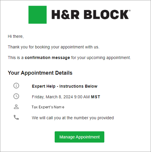 - At the time of the call, your Tax Expert will contact you based on the information you provided when you booked your service.