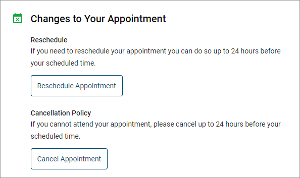 When you arrive, scroll down the page, and click Reschedule or Cancel Appointment to make changes to your appointment.