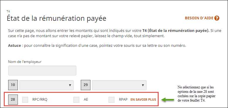 Lorsque vous saisissez des renseignements figurant sur votre feuillet T4 papier dans le logiciel d'impôt H&R Block, assurez-vous que les options de la case 28 ne sont cochées que si un X apparaît dans les cases RPC/RRQ, AE ou RPAP de votre feuillet T4. Vous devriez laisser la case 28 vide si des montants pour le RPC/RRQ, l'AE ou le RPAP ont été déduits de votre paie dans l'année.
