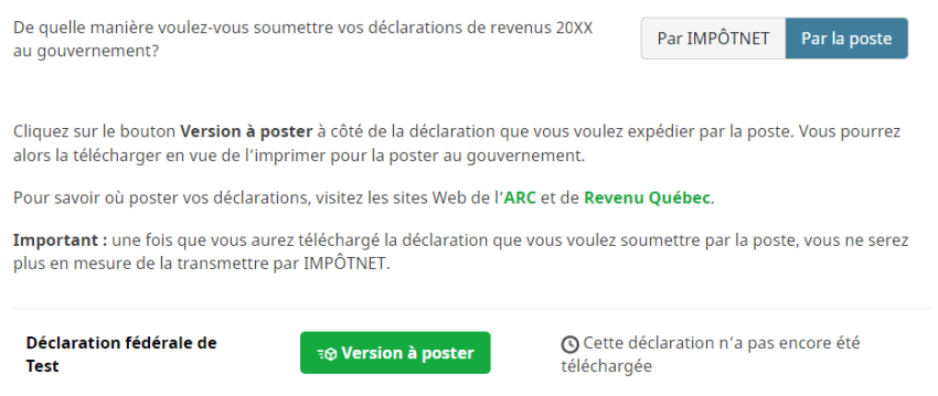 Remarque : une fois que vous avez choisi de produire vos déclarations par la poste dans l'onglet Soumettre, vous ne pouvez plus les transmettre par ImpôtNet.