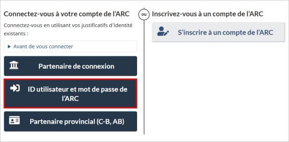 Connectez-vous à votre compte Mon dossier de l’ARC en inscrivant votre ID utilisateur et votre mot de passe ou en sélectionnant votre partenaire de connexion.