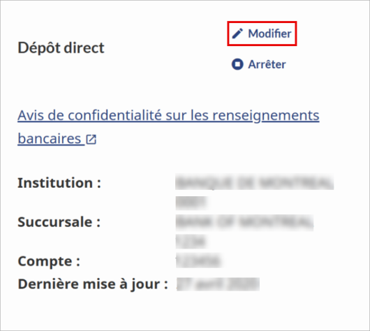 Important : vous ne pouvez pas faire, annuler, ni modifier une demande de dépôt direct au moment de transmettre votre déclaration à l'ARC par ImpôtNet. Vous devez mettre à jour vos renseignements relatifs au dépôt direct auprès de l'ARC avant de transmettre votre déclaration. Sinon, la l'ARC utilisera les renseignements qui figurent déjà dans votre dossier.