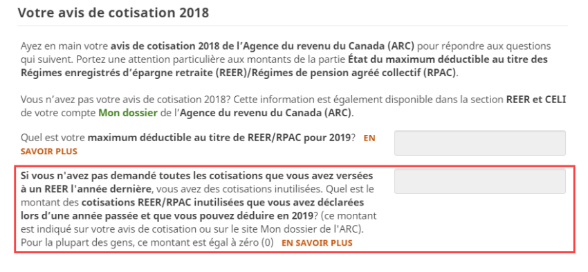 Remarque : si vous téléchargez vos renseignements dans vos déclarations à partir du site Web de l'Agence du revenu du Canada (ARC) en utilisant le service PMD, vos cotisations à un REER, votre maximum déductible et tout montant inutilisé seront automatiquement téléchargés dans vos déclarations.