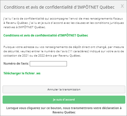 Remarque : il n'est pas possible de changer votre adresse postale ou celle de votre conjoint(e) par l'intermédiaire d'ImpôtNet lorsque vous transmettez votre déclaration de revenus fédérale ou celle de votre conjoint(e). Si vous êtes un résident du Québec, vous pouvez mettre à jour votre adresse postale lorsque vous transmettez votre déclaration du Québec par ImpôtNet, à condition d'avoir le numéro de votre avis de cotisation de l'année précédente. Consultez la section « Changement d'adresse auprès de Revenu Québec » ci-dessous pour en savoir plus.