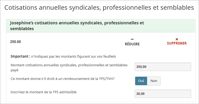 Si vous avez payé des cotisations professionnelles ou syndicales qui ne figurent pas sur votre feuillet T4 ou votre relevé 1, mais que vous avez obtenu un reçu de l'organisation à laquelle vous avez payé ces cotisations, vous pouvez entrer le montant à la page Cotisations annuelles syndicales, professionnelles et semblables :
