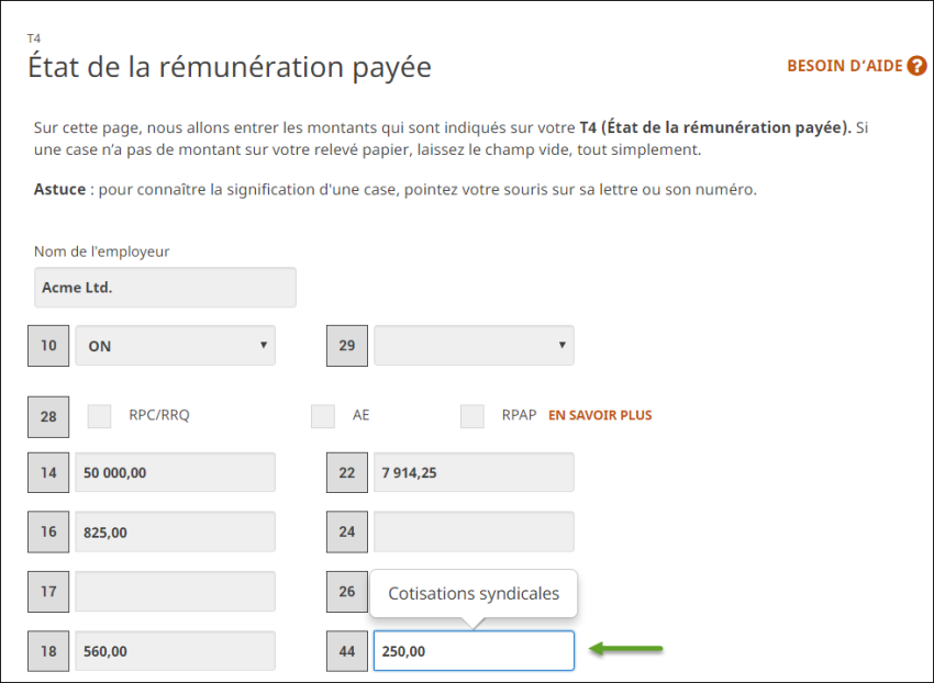 - Lorsque vous serez à la page T4, entrez le montant figurant à la case 44 de votre feuillet T4 dans le champ prévu à cet effet du logiciel H&R Block :