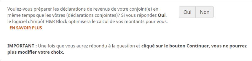 Remarque : une fois que vous avez choisi le type de déclarations qui vous convient (conjointes ou non), vous ne pourrez plus modifier ce choix dans le logiciel d’impôt H&R Block. Si vous changez d’idée, vous devez tous les deux recommencer une nouvelle déclaration de revenus.
