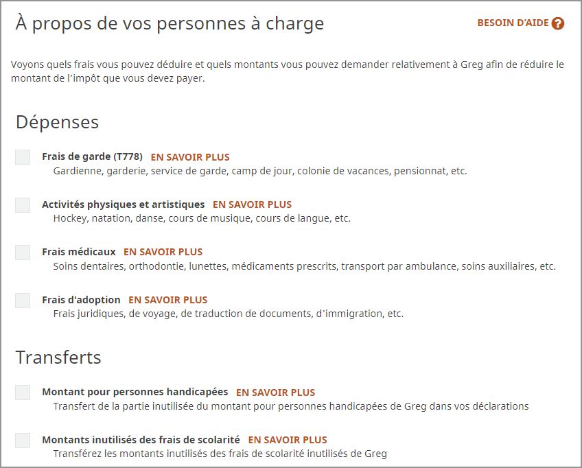 - Choisissez les dépenses que vous souhaitez déduire pour cette personne à charge.