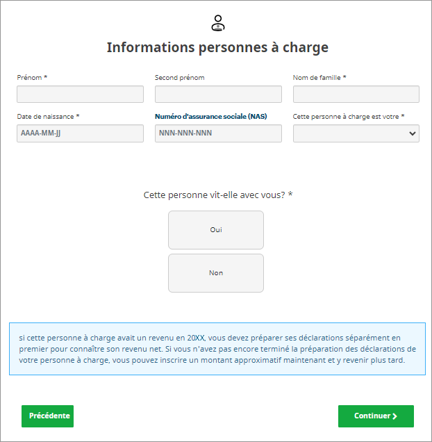 Sur la page , ajoutez les renseignements relatifs à votre personne à charge. Puis, cliquez sur Continuer.
