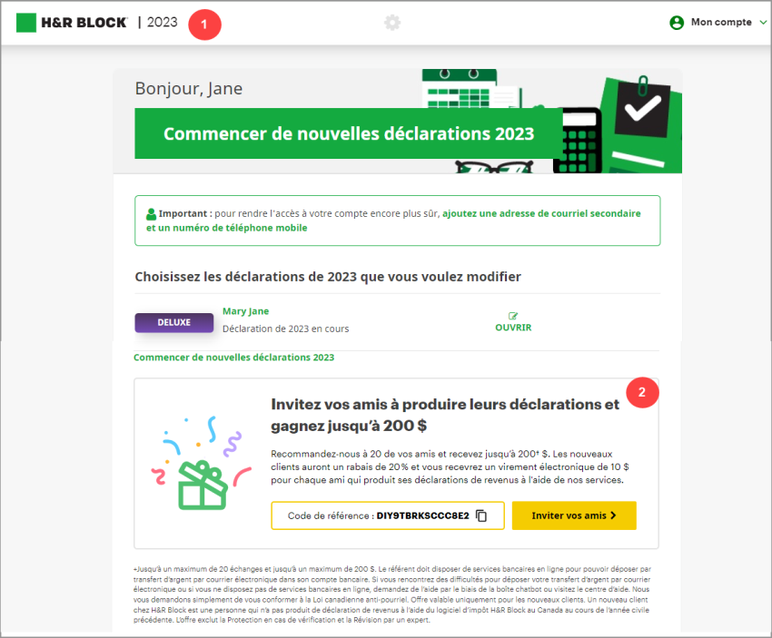 *Conditions : jusqu'à concurrence de 20 primes et d'un montant maximum de 200 $. La personne qui recommande le logiciel d'impôt doit détenir un compte bancaire en ligne afin que les fonds à déposer puissent y être virés par courriel. S'il n'est pas possible de virer des sommes d'argent par courriel dans votre compte ou si vous n'avez pas de compte en ligne, composez le 1 800 HRBLOCK pour obtenir l'assistance de l'un de nos agents. Nous vous demandons simplement de vous conformer à la Loi canadienne sur le pourriel. Offre valide pour les nouveaux clients seulement. Un nouveau client de H&R Block est une personne qui n'a pas produit ses déclarations de revenus à l'aide du logiciel d'impôt H&R Block au Canada entre le 1er janvier 2025 et le 31 décembre 2025. L'offre exclut les services Protection en cas de vérification et Révision par un expert.