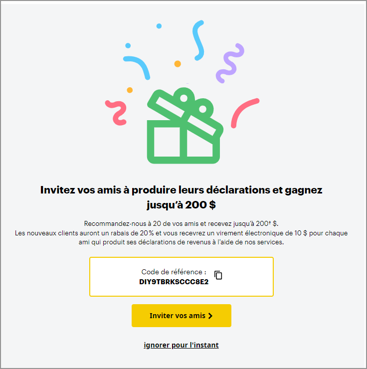 Économisez 20 % sur le prix d'un forfait DELUXE, SPÉCIALISÉ, ou TRAVAILLEUR AUTONOME lorsque vous utilisez le code Recommandez un ami. Vous pouvez toujours produire vos déclarations gratuitement si vous le souhaitez, mais si vous choisissez le forfait GRATUIT, assurez-vous simplement d’inscrire votre code Recommandez un ami sur la page de vente afin que l’ami qui vous a référé obtienne son crédit.